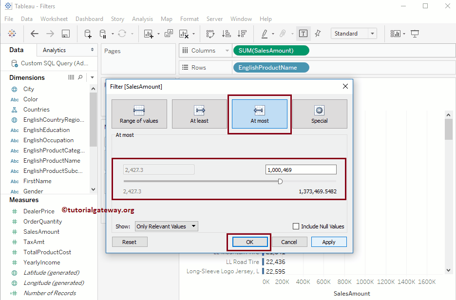 此 Tableau 度量值过滤器选项卡允许您仅选择最大值。为了演示目的,我们将值更改为 1,000,469。