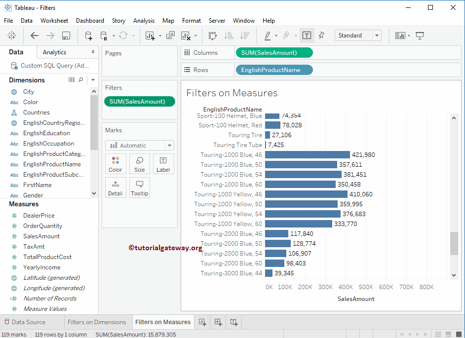 对于这个 Tableau 度量值过滤器示例,首先,将“维度”区域中的“英文产品名称”拖放到“行”架上,并将“Sales Amount Measures”区域拖放到“列”架上。默认情况下,它将生成条形图。请记住,我们的报表中共有 130 个标记。下面的屏幕截图将向您展示报表预览。