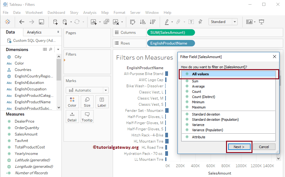 将“Sales Amount”拖放到“Filters Shelf”后,将打开一个新的“Filter Field”窗口。此窗口具有“All Values”、“Aggregate functions”、“Standard deviation”和“Variance”选项。