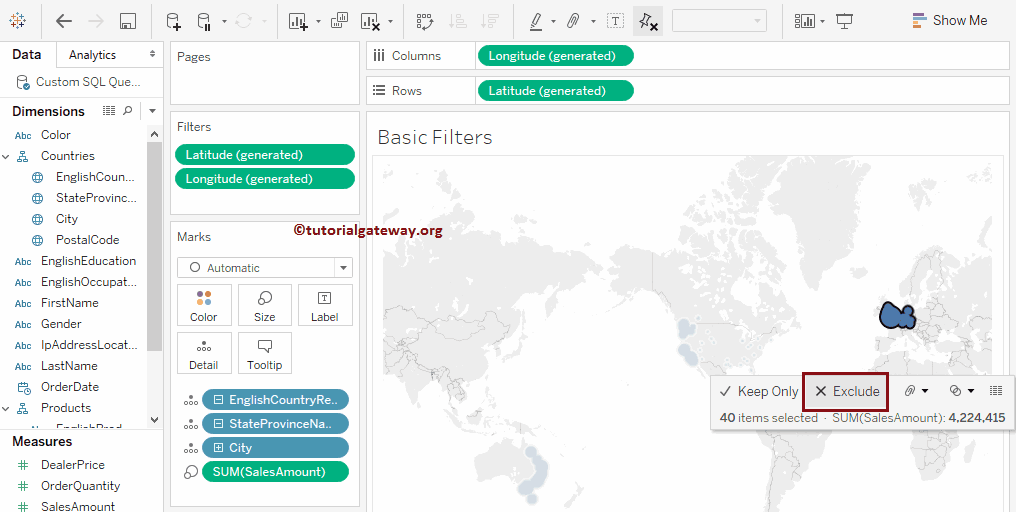 我们从地图中选择了欧洲地区的数据点。接下来,我们使用“地图排除”选项来创建筛选器。这意味着我们正在使用一个条件,说明该区域的销售额应被限制显示。