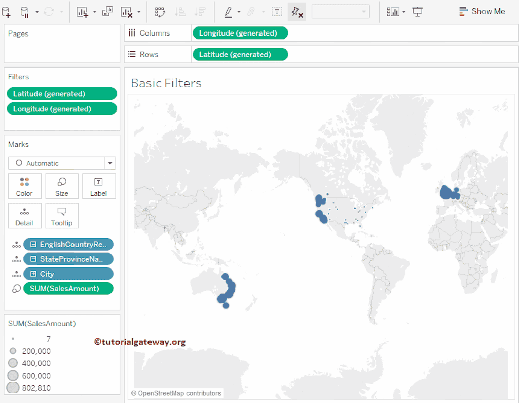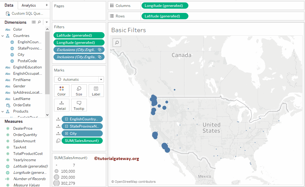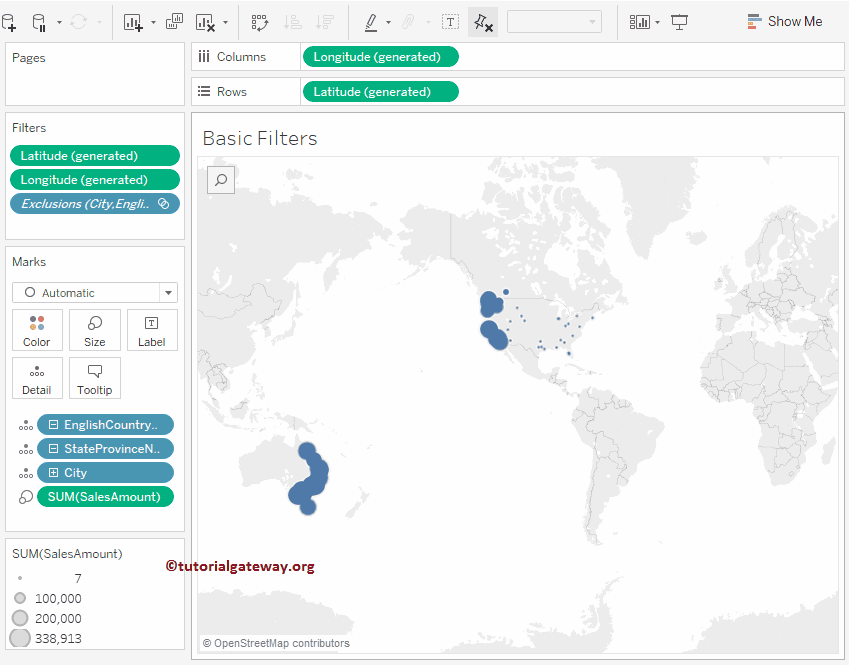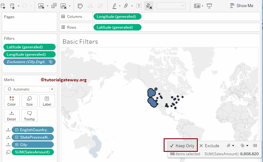 我们从地图中选择了美国地区的数据点。接下来,我们使用“保留”选项。这意味着我们正在使用 Tableau 条件筛选器,说明应仅显示美国地区的销售额。