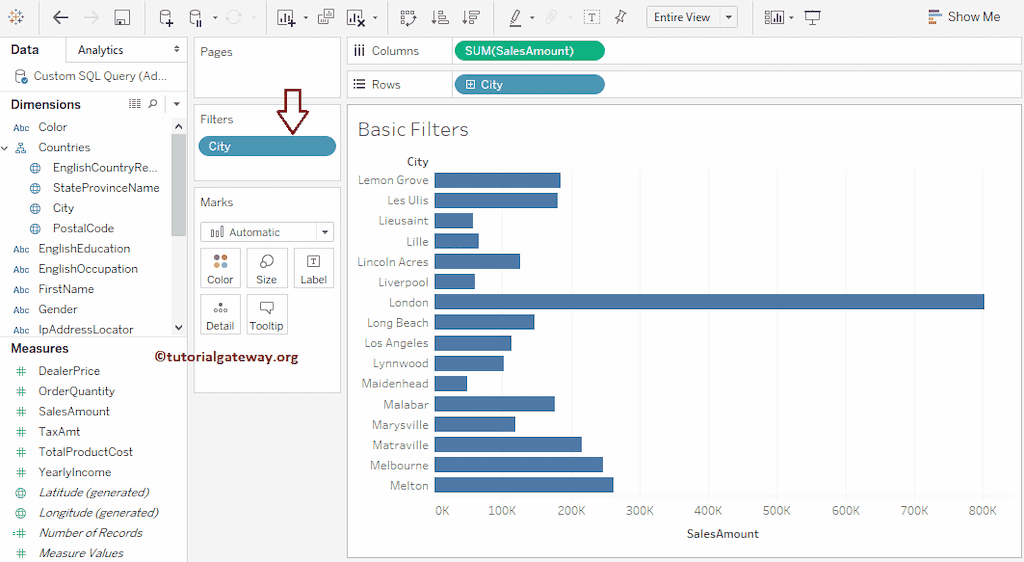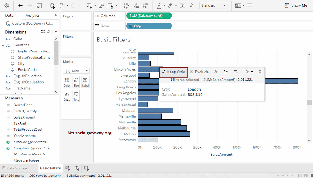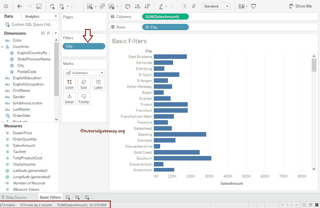 为了演示筛选器,首先,将维度区域中的城市名称拖放到“行”架上,并将“销售额”度量区域拖放到“列”架上。默认情况下,它将生成条形图,如下图所示。请记住,我们的报告有 269 行。