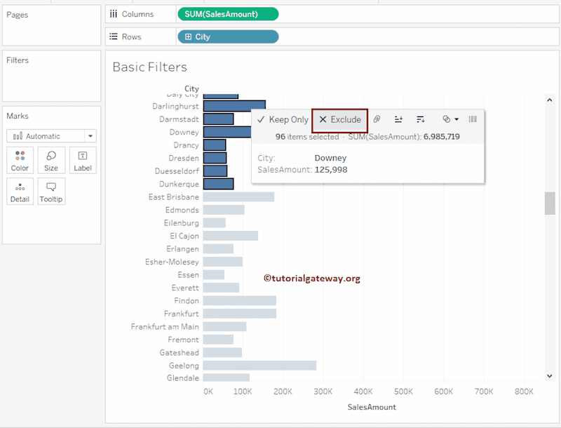 在本例中,我们将使用“排除”选项。在这里,我们从条形图中选择了前 96 个城市。接下来,我们使用工具提示中的“排除”选项将这些记录从条形图中删除。这意味着我们正在使用一个筛选器,说明应限制显示所选名称的城市。