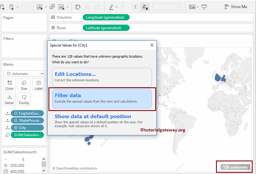 将“销售额”度量区域拖放到“列”架上,将维度区域中的“城市名称”拖放到“行”架上。默认情况下,桌面将生成条形图。因此,请使用“显示方式”架将其更改为地图。否则,双击“城市”并将“销售额”添加到大小,这将为您创建地图。如您所见,地图显示有 128 个未知区域。