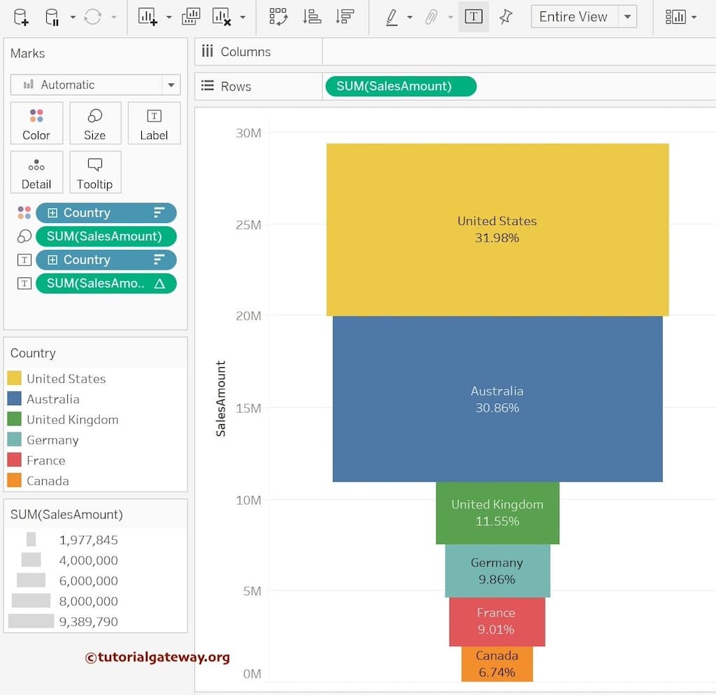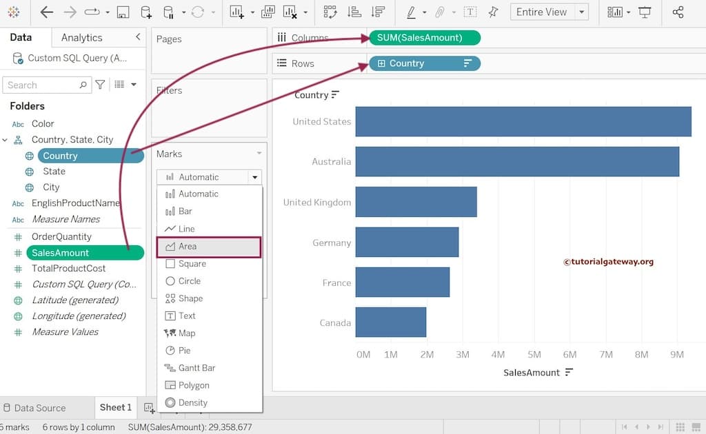 首先,我们必须按销售额数据以降序对国家/地区名称进行排序。为此,请单击工具栏上的“按降序排序”选项。接下来,如下图所示,我们必须将“标记”类型从“自动”(默认为条形)更改为“面积”,这时就会发生真正的变化。