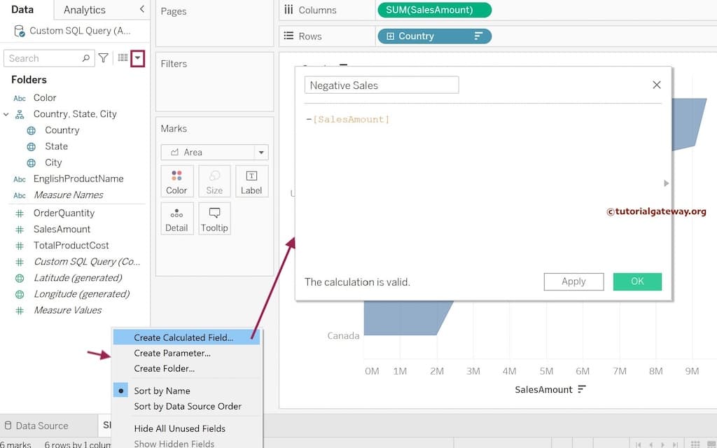 首先,为销售额度量值创建负值计算字段。我们可以通过多种方式创建计算字段。我们通过右键单击空白区域并从上下文菜单中选择“创建计算字段”选项来实现。选择“创建计算字段”选项后,将打开一个新窗口来创建新的计算字段。让我们在其中添加 – (SalesAmount) 代码。