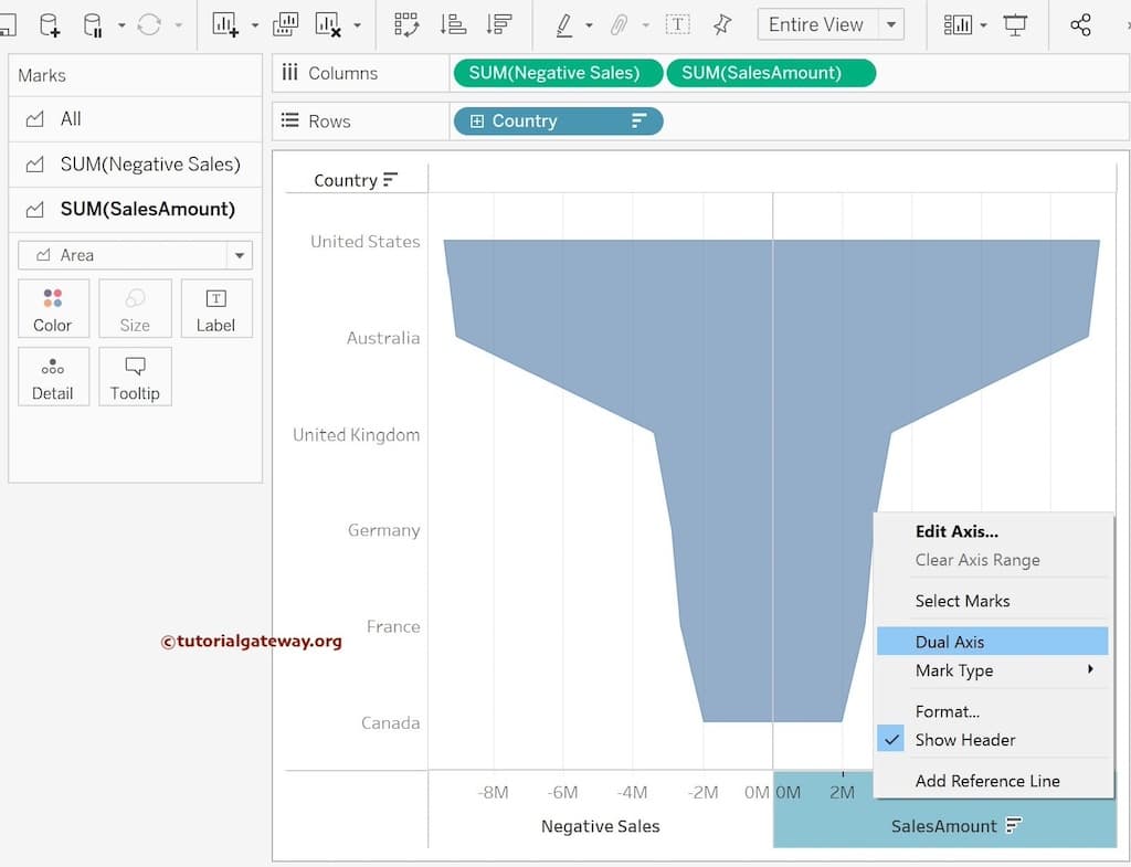 下一步是使用双轴选项合并负销售额和销售额。因此,右键单击销售额轴,然后从上下文菜单中选择“双轴”选项。