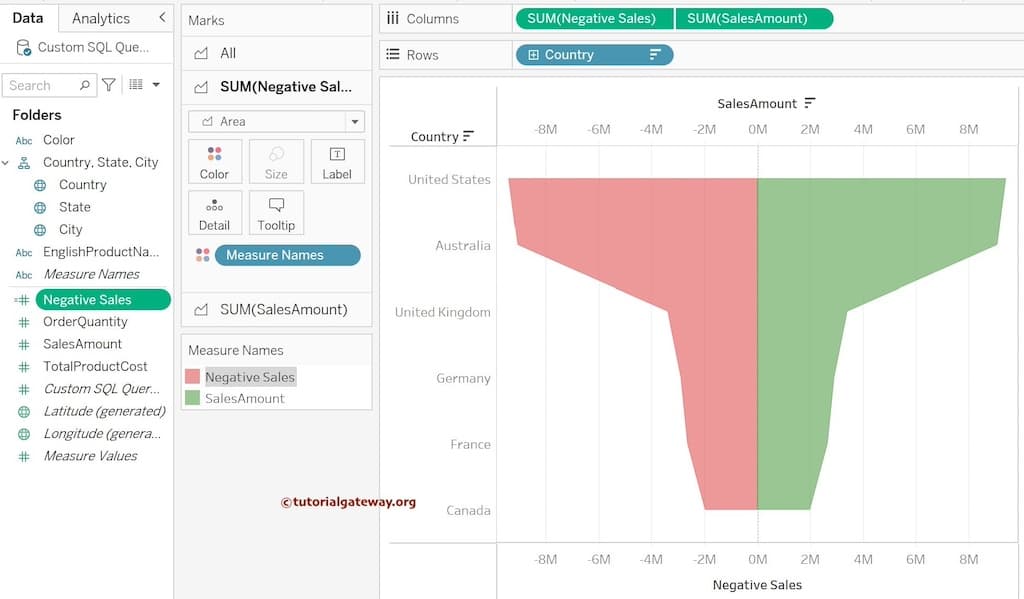 下图显示了 Tableau 传统漏斗图,其中显示了负销售额和销售额,前者为红色,后者为绿色。