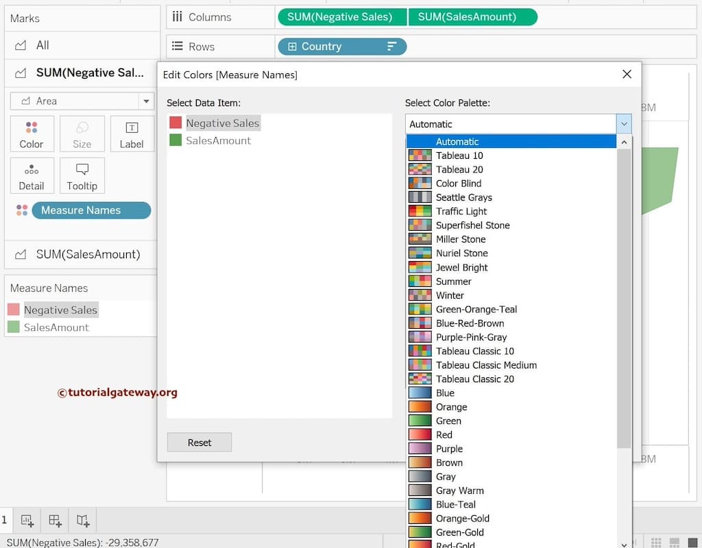 单击它后,将显示以下窗口。单击您感兴趣的颜色。我们现在为正销售额选择绿色。下图将显示最终输出,即我们在 Tableau 中的传统漏斗图。
