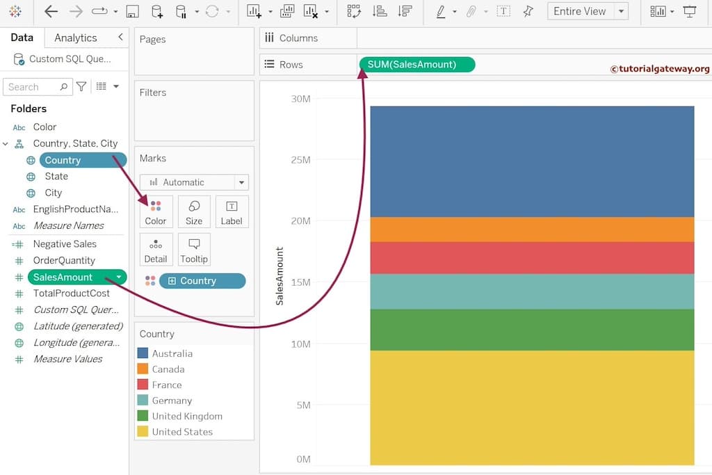 其次,将“国家”维度从“维度”区域拖放到“标记”功能区中的“颜色”字段。拖动它们后,将显示以下屏幕截图。