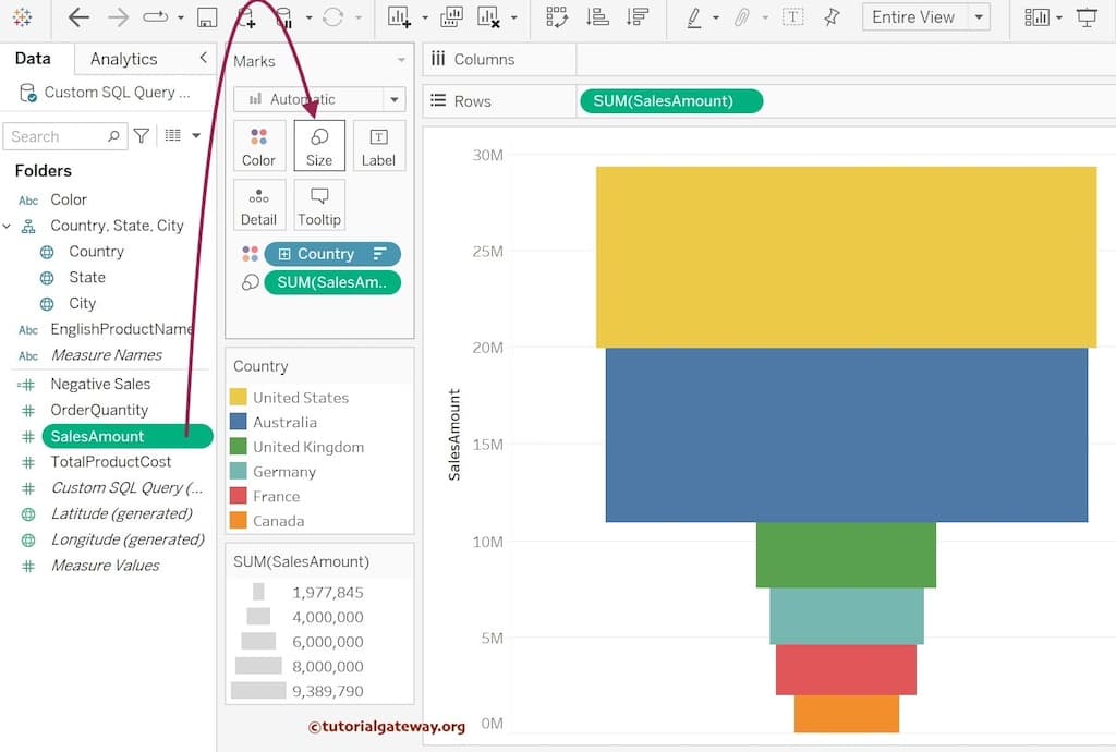我们必须使用销售额将数据条按降序排序。为此,请单击工具栏中的“按降序排序”选项以生成 Tableau 漏斗图。接下来,将“销售额”从“度量”区域拖放到“标记”功能区中的“大小”字段,如下所示。拖动后,桌面将显示图表。