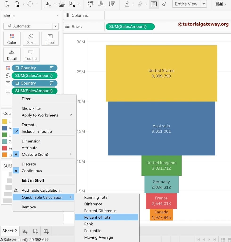 单击 SUM(Sales Amount) 旁边的向下箭头选择快速表计算,然后单击总计百分比以在漏斗图中显示百分比。