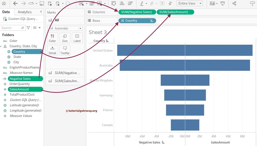 将“国家”维度拖放到“行”功能区。接下来,将先前创建的负销售额计算字段(负销售额)和销售额添加到“列”功能区。