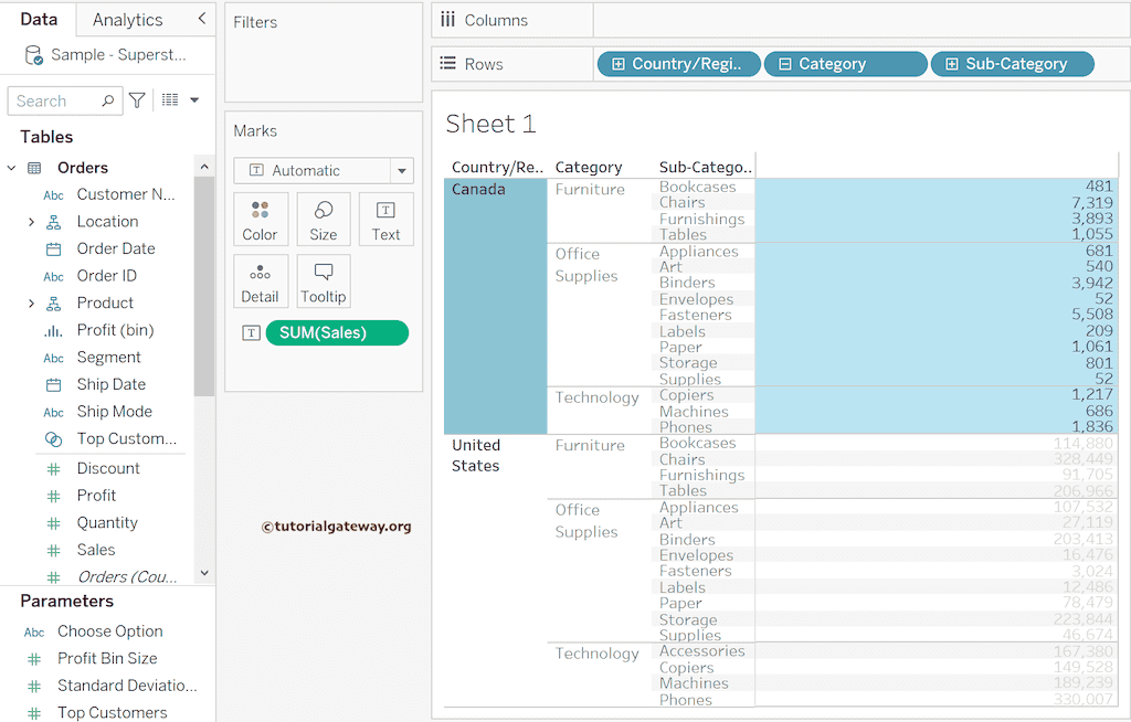 我们需要至少两个工作表来演示 Tableau 突出显示操作筛选器,因此我们创建了三个工作表来执行多级突出显示操作。我们使用了 Sample Superstore Excel 表进行此饼图、条形图和表格报告。请访问 Excel 源 文章,以了解 数据源。