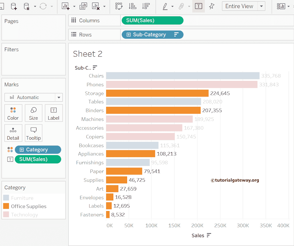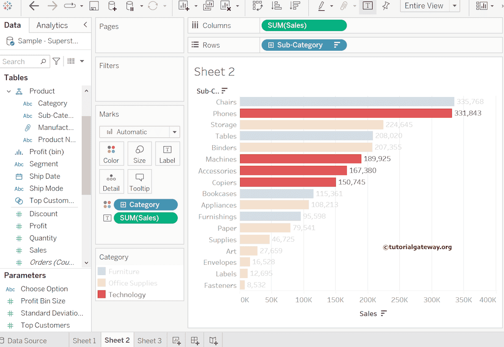 我们的任务是对工作表执行突出显示操作筛选器,因此请转到“工作表 2”,通过将“销售额”添加到“列”架和“子类别”维度添加到“行”架来创建条形图。要添加颜色并显示数据标签,请将“类别”添加到“颜色”,将“销售额”添加到“标签”架。有关 Tableau 中其余图表的信息,请单击此处。