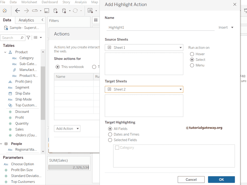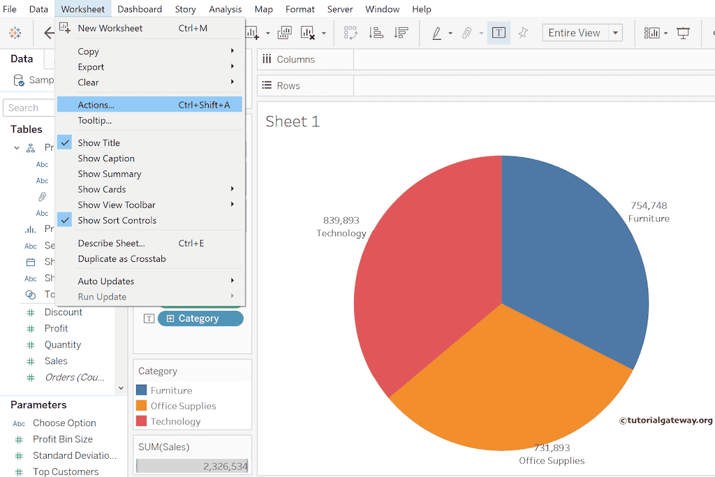 要创建 Tableau 突出显示操作筛选器,请使用“工作表”菜单并选择“操作”选项。或者,使用快捷键 Ctrl + Shift + A。