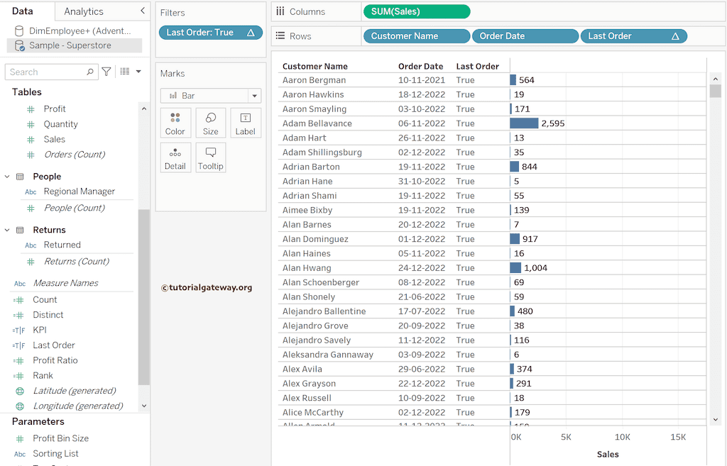 下面的 Tableau LAST 函数截图显示并查找了最近或最新的客户订单日期。