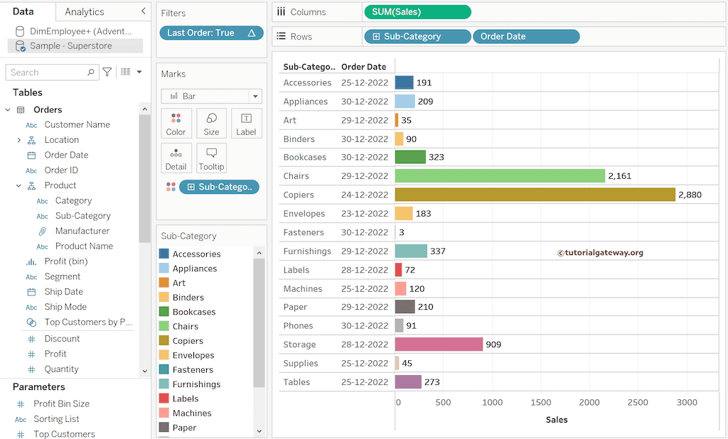 接下来,将“Last order”从“Rows”架拖到“Filters”架,以删除 True/False 列。接下来,将“Subcategory”添加到“Color”架,并为柱形图添加颜色。下面的 Tableau LAST 函数图像显示了基于订单日期的产品子类别中的最新或最近订单。