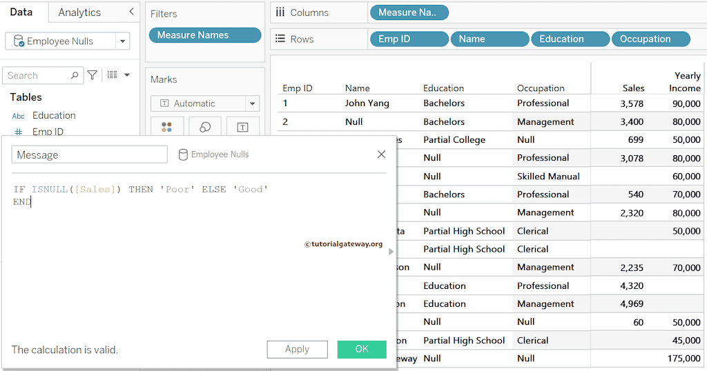要查看 ISNULL 函数的输出,我将 Message 计算字段添加到 Table 的 Rows 区域。查看输出,您可以看到非 NULL 值的 Good 消息和 NULL 值的 Poor 消息。有关更多内置函数 >> 单击此处!