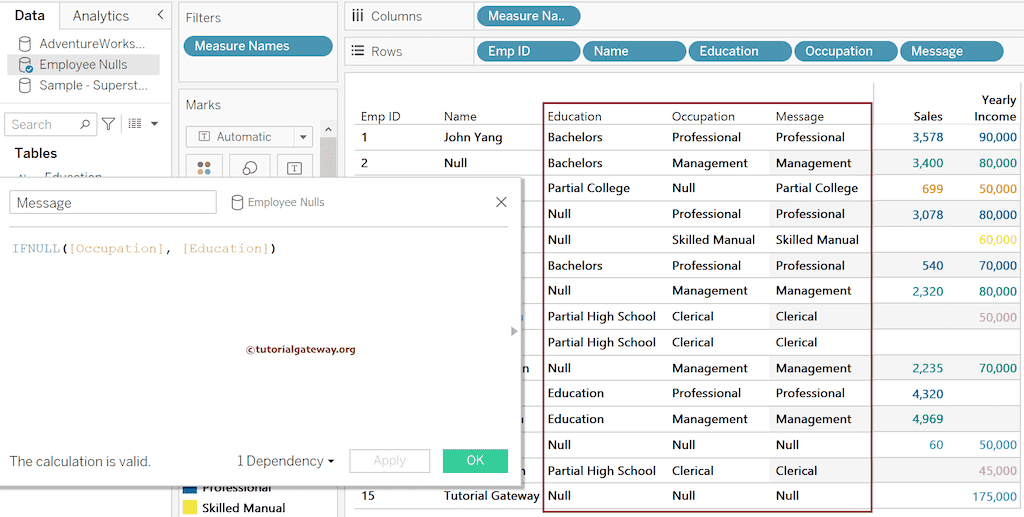 此 Tableau 示例使用 IFNULL 函数检查 Occupation 列中的 NULL 值。下面的表达式将 Occupation 列中的 NULL 值替换为相应的 Education 列文本。如果 Occupation 和 Education 列的值都为 NULL,则 IFNULL 函数将返回 NULL 值。当我们单击“应用”按钮时,您将在下面的图像中看到更改。