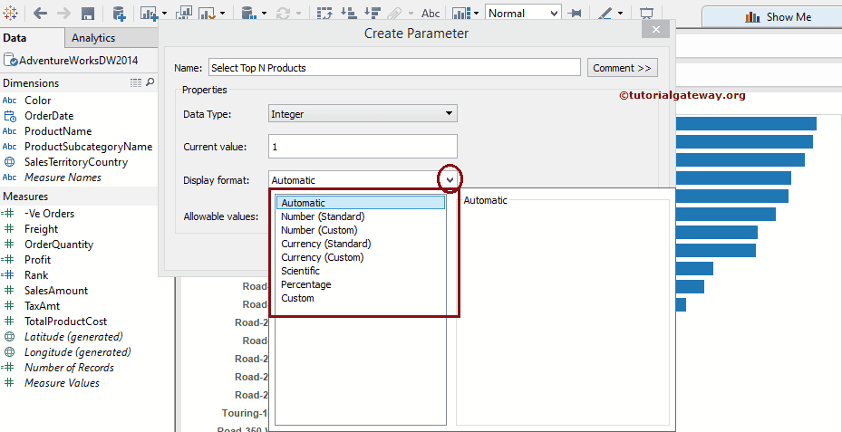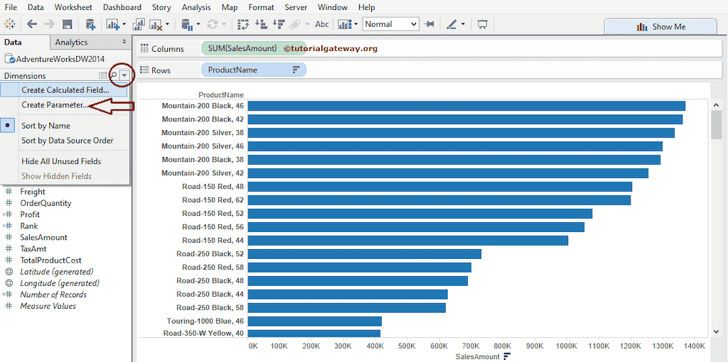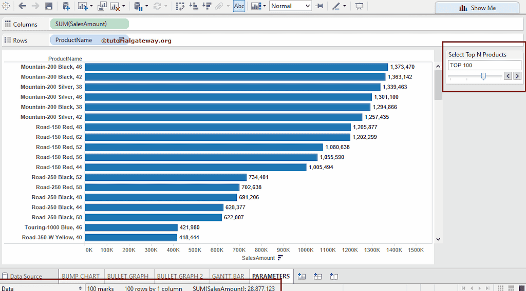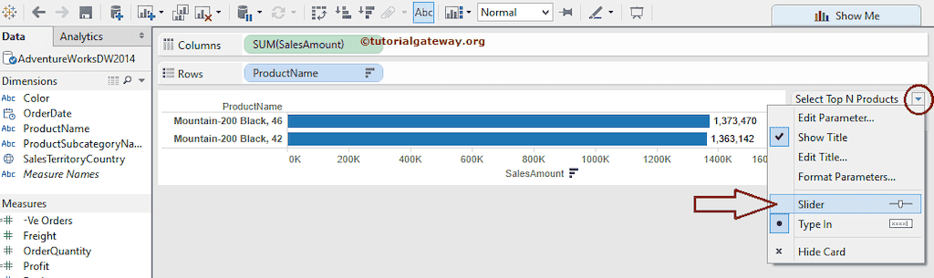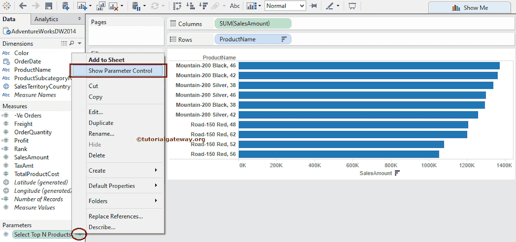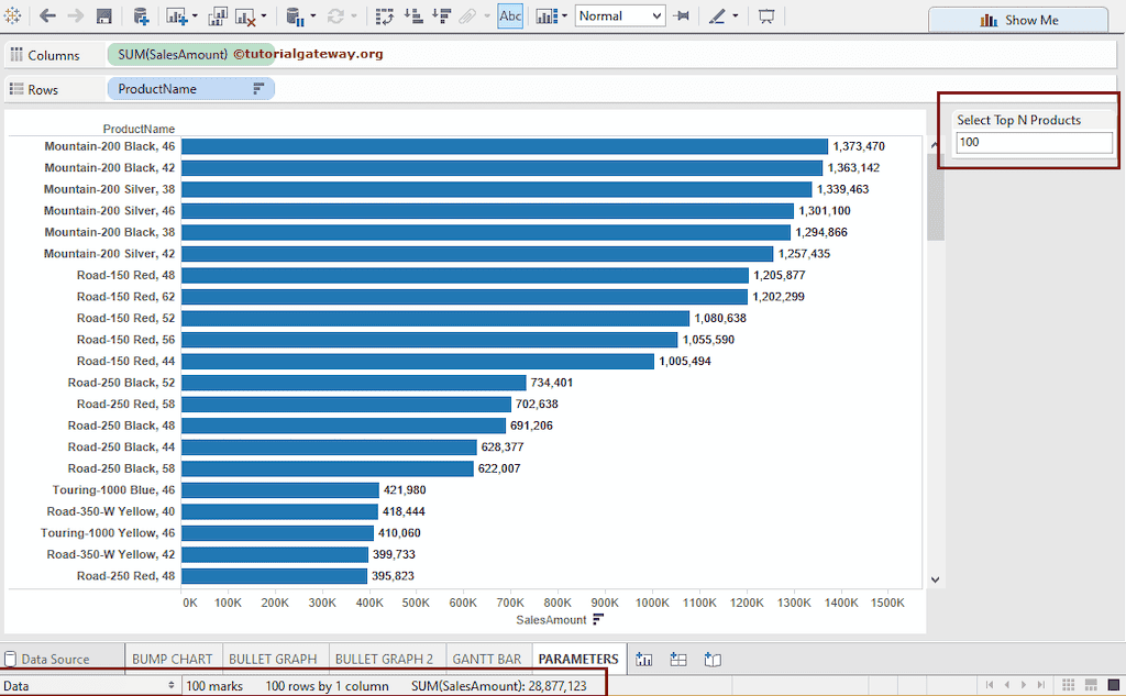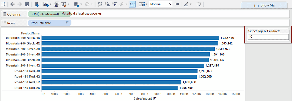 对于此 Tableau 参数示例,我们按“销售额总计”选择了 Top N 产品。我们没有写入常量 10,而是添加了值。