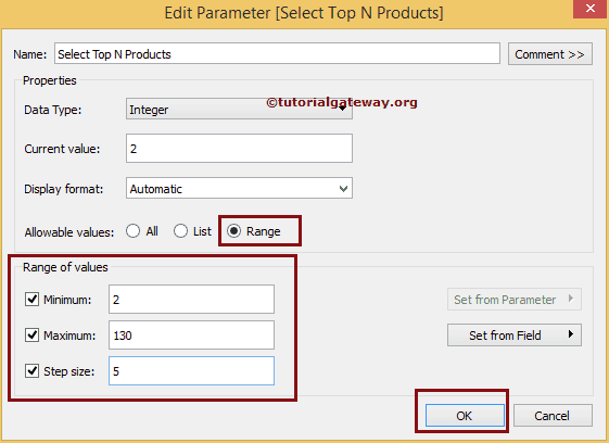 让我们将 Tableau 参数的“允许的值”从“所有”更改为“范围”,并添加最小值和最大值。