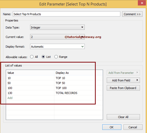 让我们看看当我们将“允许的值”从“所有”更改为“范围”时会发生什么。要编辑现有参数,请单击参数名称(选择 Top N 产品)右上角的下拉箭头,然后选择“编辑...”选项。请参考此之前的第三张图片。