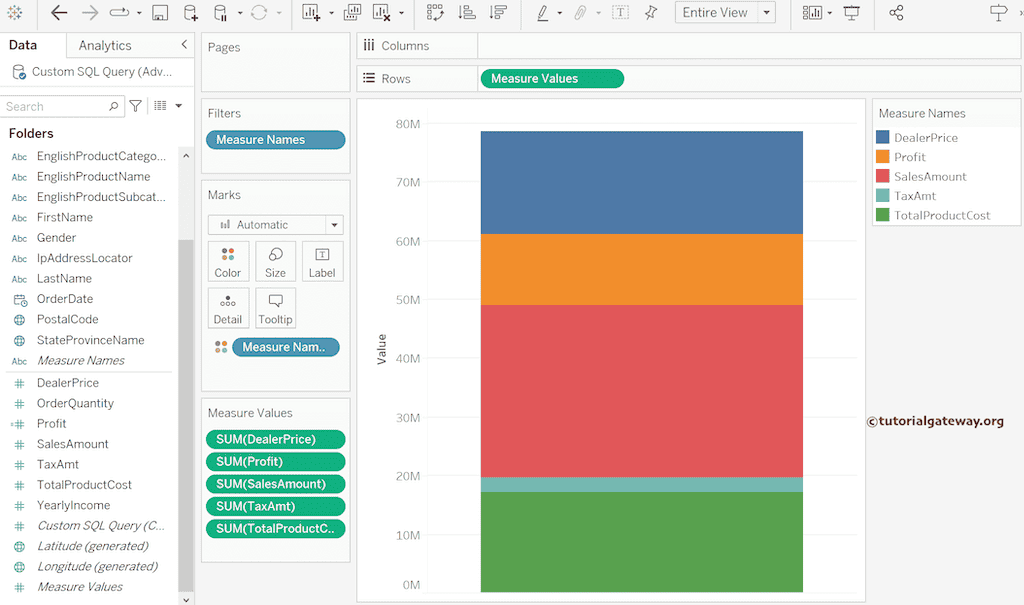 由于数据之间没有平衡,我将通过简单地将“年收入”、“自定义 SQL 查询计数”和“订购数量”拖到“度量值”中来删除它们。否则,请选择它们并单击“排除”按钮进行过滤。接下来,将“度量名称”字段从“列”架拖到“颜色”架。