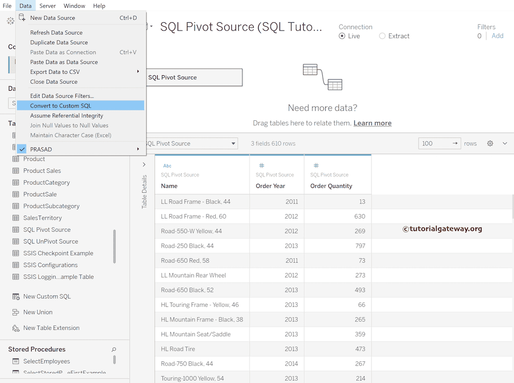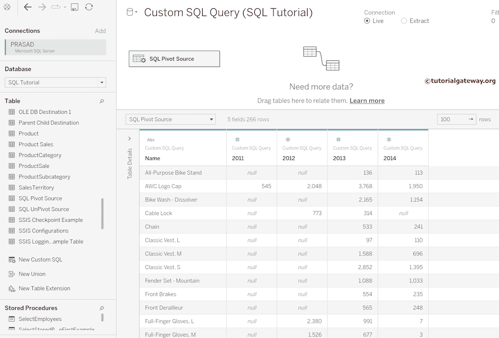 首先,将 Tableau 连接到 Microsoft SQL Server,然后拖放表以查看其中的数据。