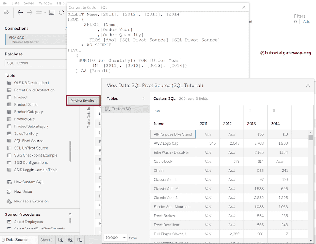 我们必须使用 PIVOT 函数编写 SQL 查询来转换非透视表列数据。接下来,单击“预览结果”选项以查看透视输出。