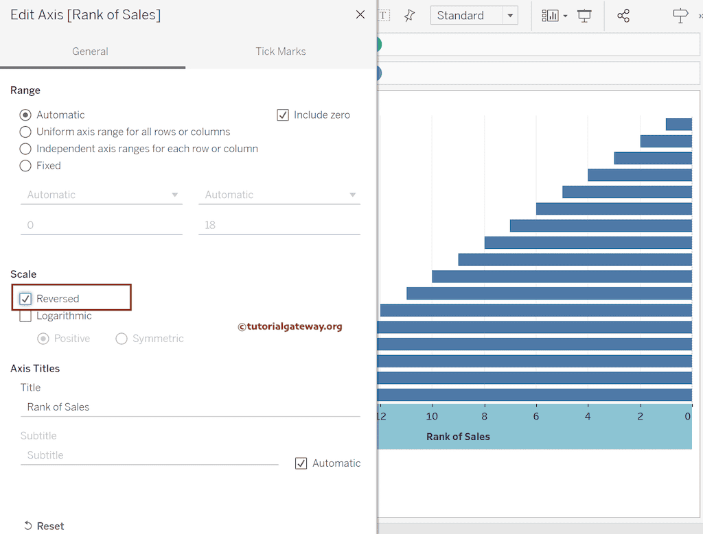 从下面的截图可以看到,表计算根据子类别的销售额提供了排名。要创建 Tableau 漏斗图,请右键单击“销售额排名”(Rank of Sales)(X 轴),然后选择“编辑轴”(Edit Axis)选项。