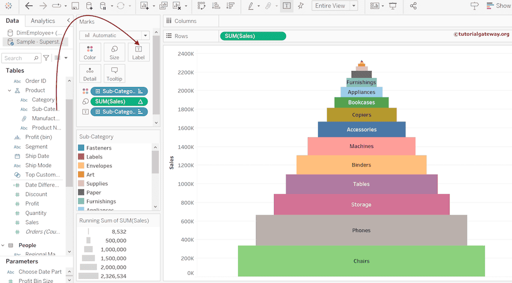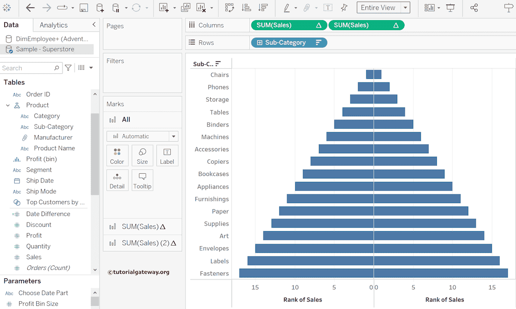 Tableau 漏斗图(Pyramid Chart)是一个由不同层或部分(台阶)组成的三角形。每个部分是一个维度,其大小取决于测量值。例如,产品子类别可以作为一层,其销售额决定了该部分的大小。