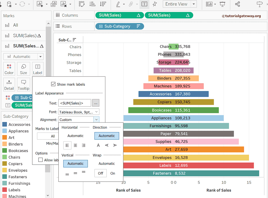 请将“子类别”维度添加到第一个 SUM(Sales) 标记的“标签”(Label)功能区,并将“销售额”度量添加到 SUM(Sales)(2) 标记的“标签”(Label)功能区。接下来,调整文本对齐方式。