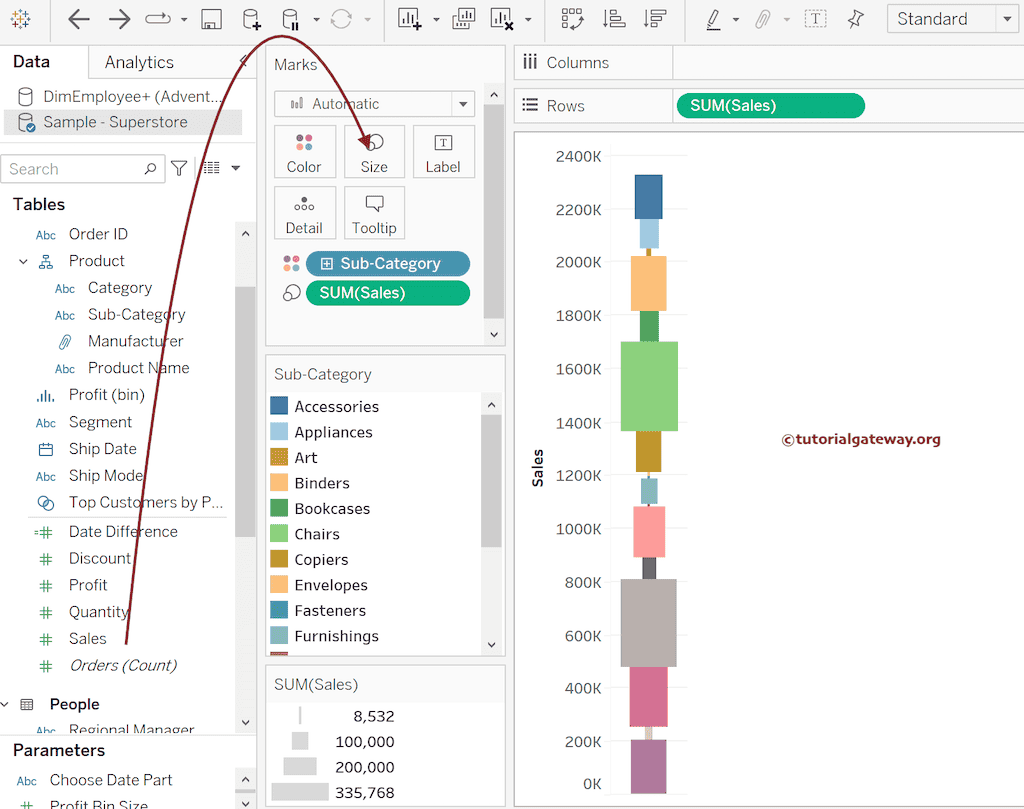 要将堆积条形图转换为 Tableau 漏斗图,请将“销售额”拖到“大小”(Size)功能区。