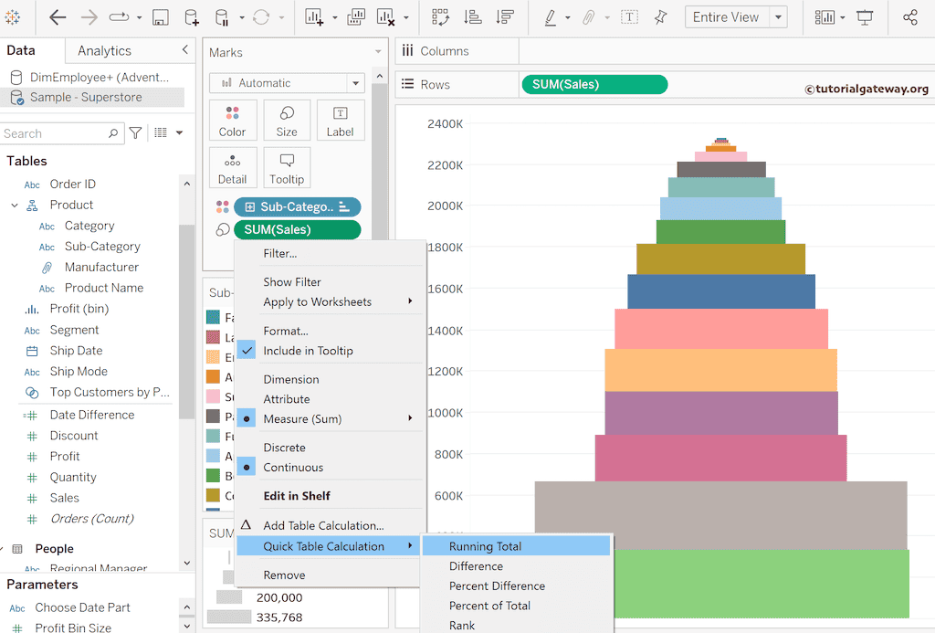 因此,在“标记”(Marks)功能区中,单击 SUM(Sales) 旁边的向下箭头,然后从上下文菜单中选择“快速表计算”(Quick Table Calculation)选项。接下来,选择“运行总计”(Running Total)。