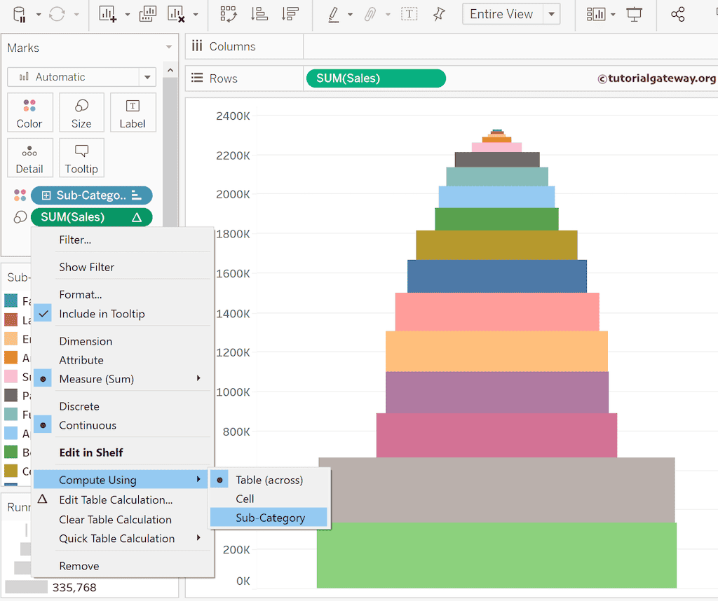再次单击 SUM(Sales) 表计算旁边的向下箭头,并将“计算依据”(Compute using)从默认的“表(Across)”更改为“子类别”。