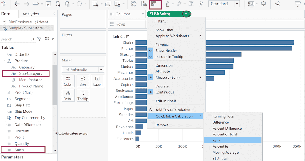 请单击“列”(Columns)功能区中 SUM(Sales) 旁边的向下箭头,选择“快速表计算”(Quick Table Calculation),然后选择“排名”(Rank)选项。