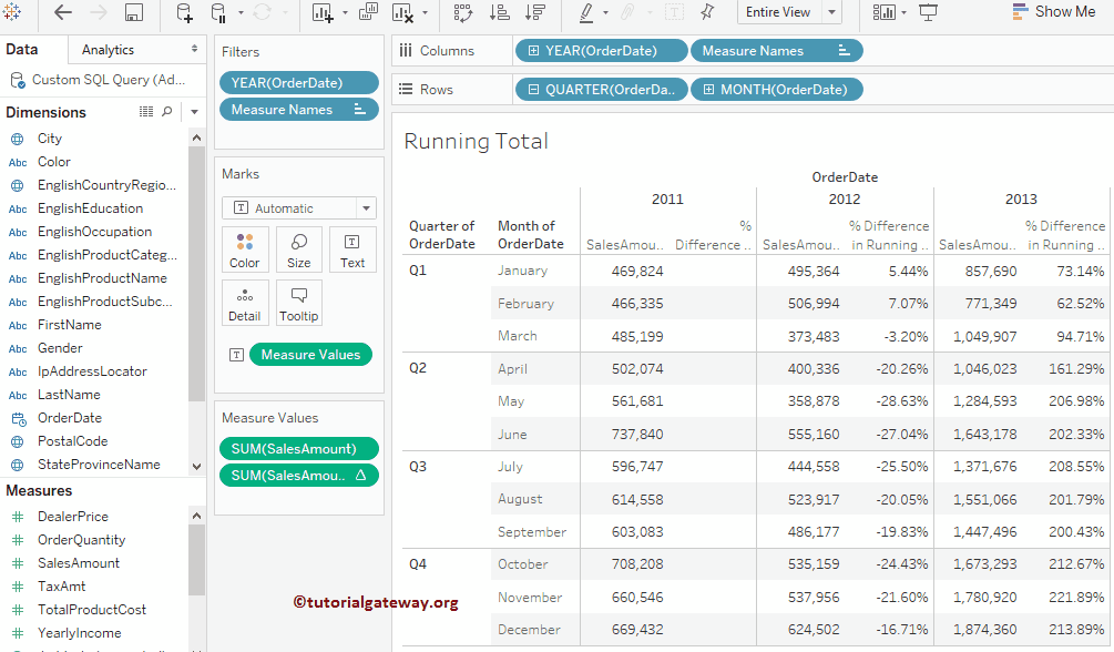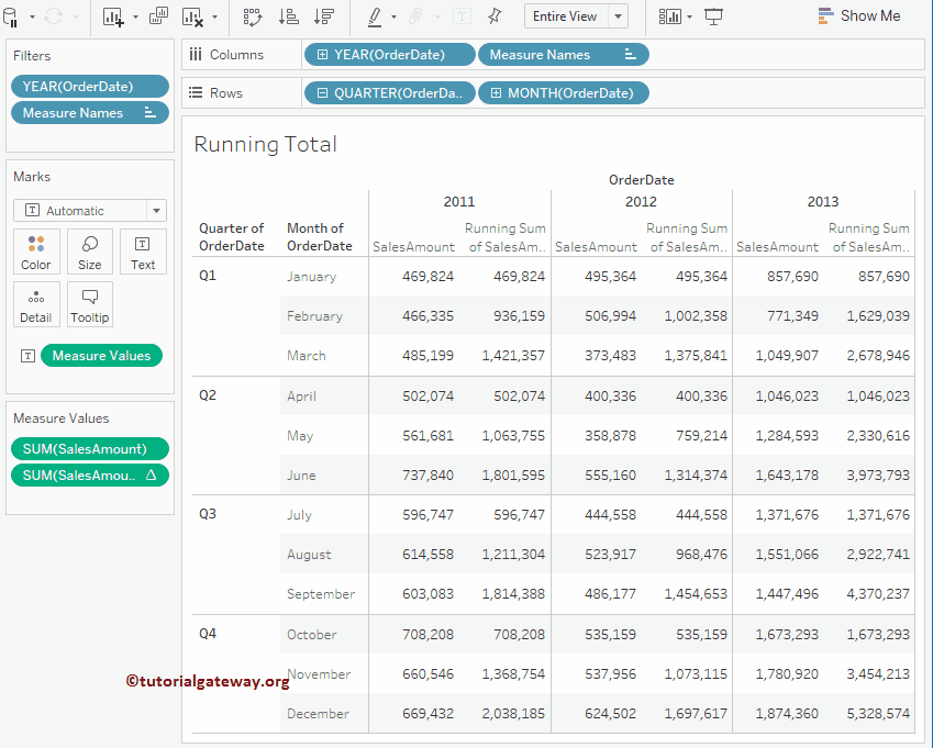 我认为显示销售金额值会很有帮助。这样您就可以将运行总计与原始销售金额值进行比较,让我们将销售金额添加到列架上。如您所见,桌面显示了每年的原始值及其运行总计。