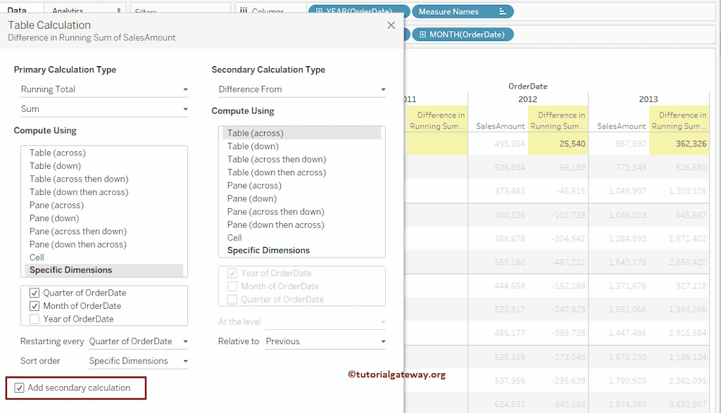 单击“编辑表计算”选项后,将打开一个名为“表计算”的新窗口。如您所见,Tableau 默认已选择最佳选项,例如“计算类型”为“运行总计”、“聚合”为“SUM”,以及“计算方式”为“指定维度”(订单日期的季度和订单日期的月份)。