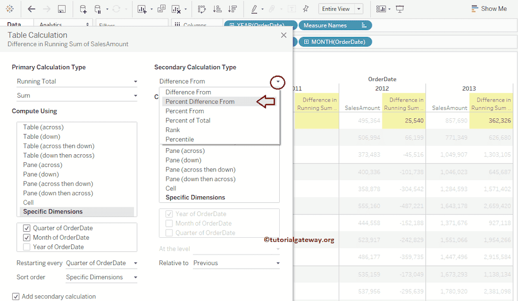 从可用选项列表中,您可以选择“添加表”选项或“快速表计算”选项。我建议您使用“添加表计算”选项。