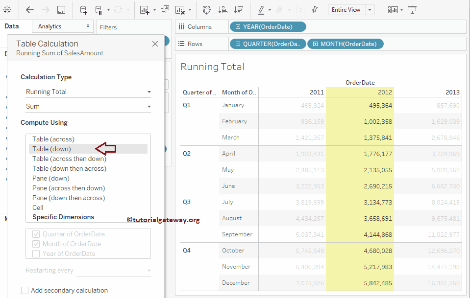 如果我们为每个分区或每个季度计算运行总计,那将是很好的。要更改实际计算,我们必须对其进行编辑。要编辑现有的表计算,请单击表计算(带有金字塔符号)旁边的向下箭头,这将打开上下文菜单。您必须选择“编辑表计算”选项。
