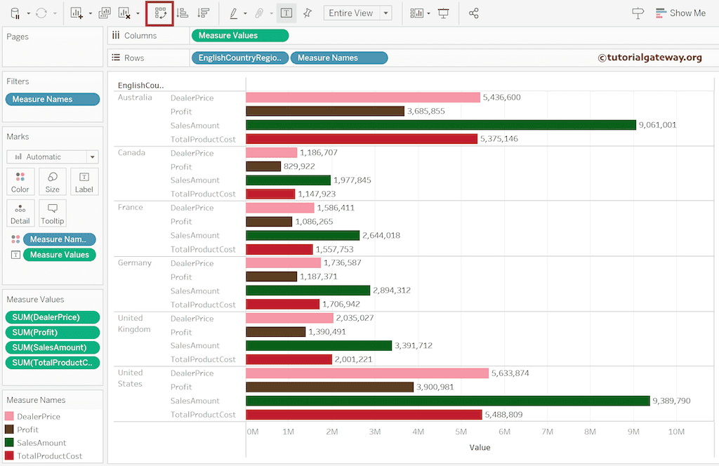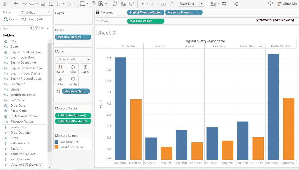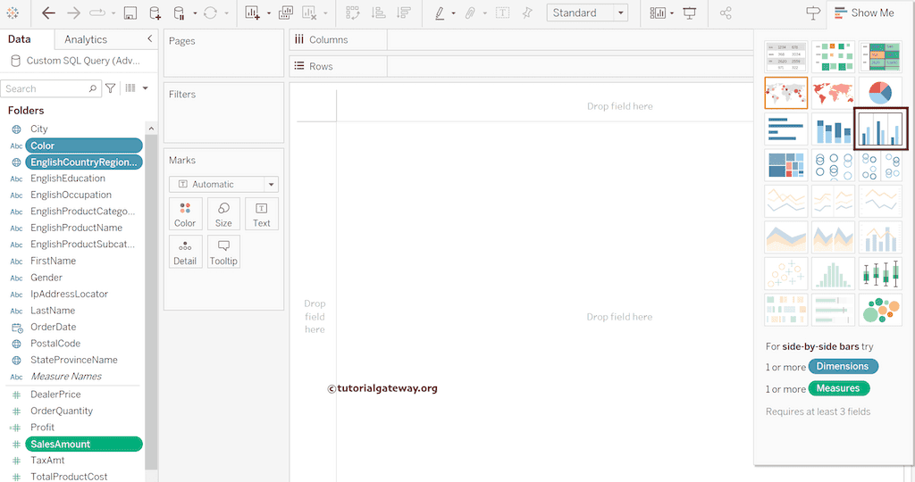 本文将通过一个示例向您展示如何创建 Tableau 并排柱状图。并排柱状图或条形图有助于针对维度或多个维度针对单个度量来查看多个度量。这意味着我们需要任何三个字段来生成此类图表。