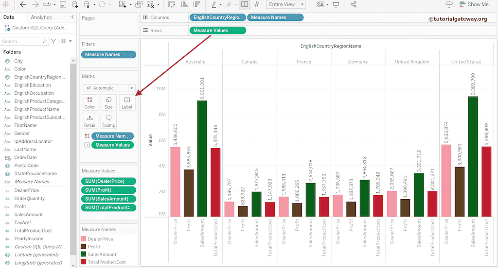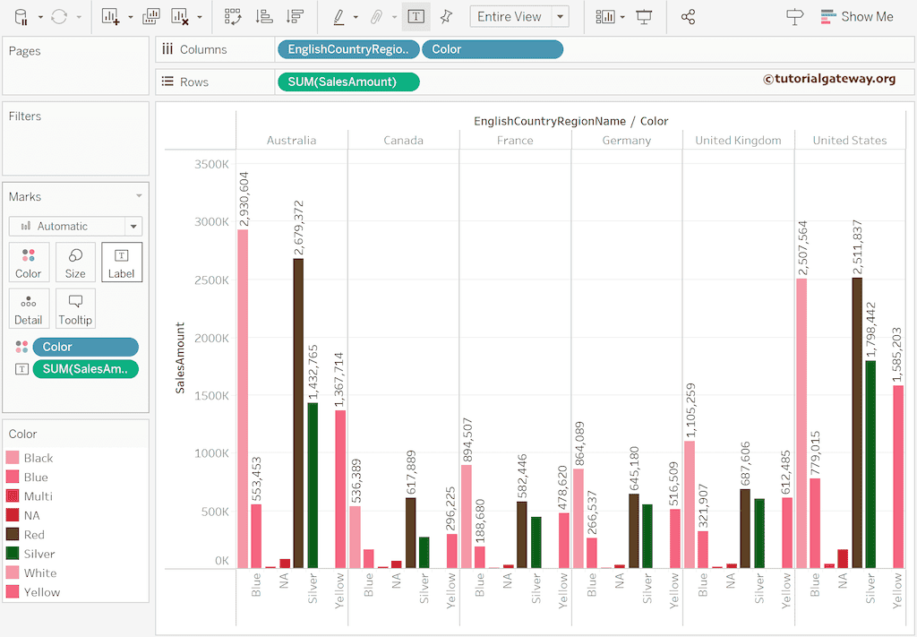 首先,我们将尝试使用两个维度与度量进行比较。因此,请选择“颜色”、“英语国家/地区名称”维度和“销售额”度量,然后在“显示方式”窗口中点击“并排条形图”选项来创建图表。