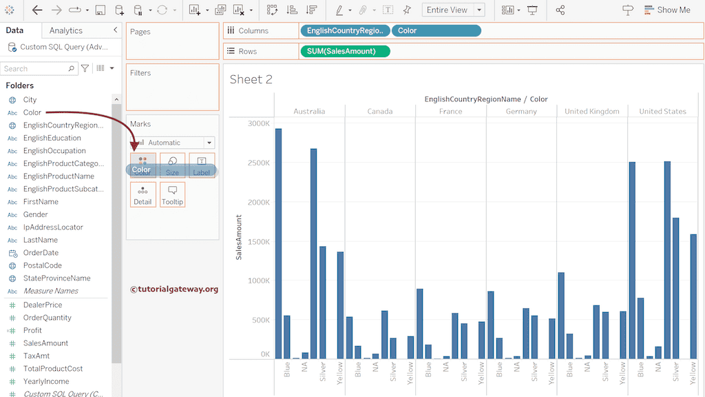 将“英语国家/地区名称”拖放到“列”架,将“销售额”拖放到“行”架以生成条形图。接下来,将“颜色”维度拖放到“列”架。