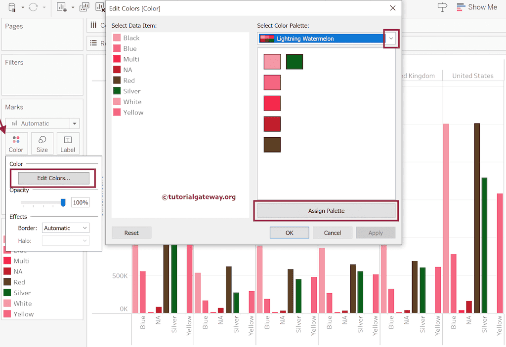 首先,展开“标记”架中的“颜色”部分,以更改矩形条的默认颜色。接下来,点击“编辑颜色”按钮以更改配色方案。在这里,我们选择了“闪电西瓜”。