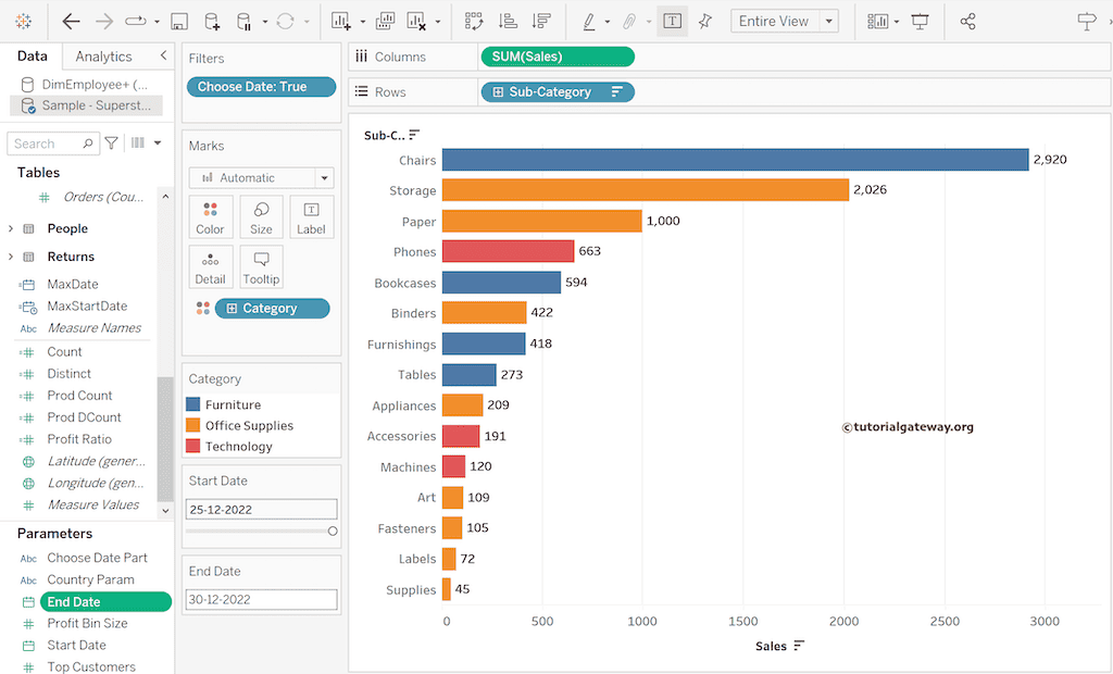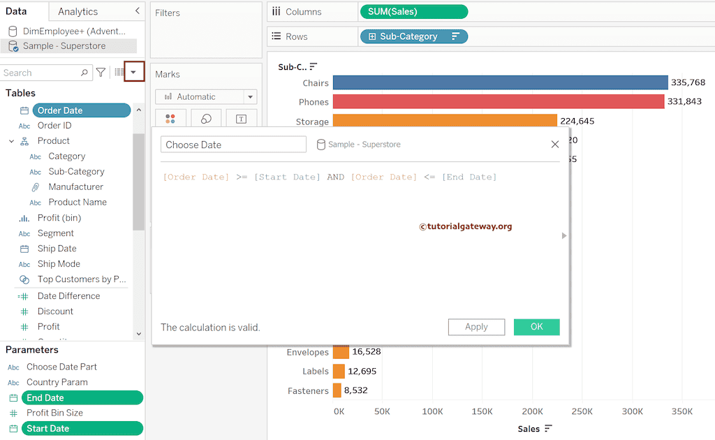 这篇 Tableau 文章解释了如何使用开始和结束日期过滤器,通过参数将报表限制在这些日期之间的记录显示。通常,在开始日期和结束日期之间查找销售额是评估业务最常见的情景。