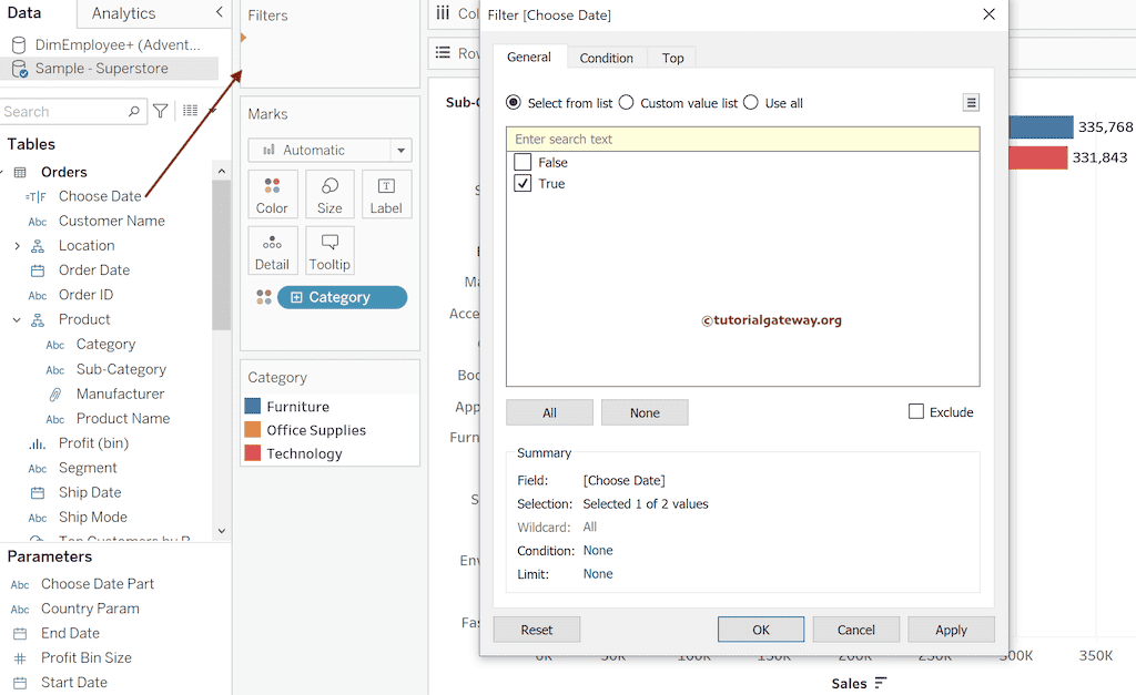 请将“选择日期”计算字段添加到“筛选器”架上,这会自动打开以下窗口。请勾选“True”选项,然后单击“确定”。这意味着如果订单日期在开始日期和结束日期之间,报表将显示子类别的销售额。