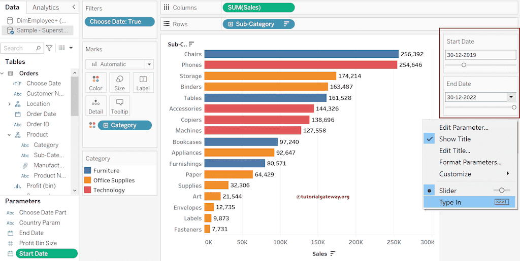 接下来,单击 Tableau“开始日期”和“结束日期”参数旁边的向下箭头,然后选择“显示参数”选项以查看和筛选报表。我将选择一些随机日期来查看这些日期之间的销售额。