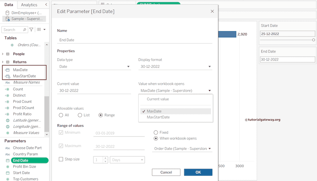 这将打开以下窗口。请将名称更改为“开始日期”,数据类型更改为“日期”或“日期/时间”,并将“允许的值”设置为“范围”。如果您有最小和最大日期的概念,则输入它们。否则,单击“添加值”按钮旁边的向下箭头,选择“数据源”,然后选择“日期”字段(订单日期)。它将自动从“订单日期”字段中找到最小(开始)和最大(结束)日期。