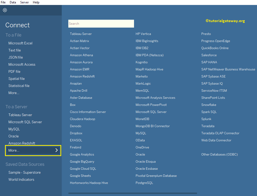 - 连接到服务器:此部分可帮助您连接 Tableau 服务器或允许您从 MySQL、SQL Server、Tableau Server 等服务器提取数据。